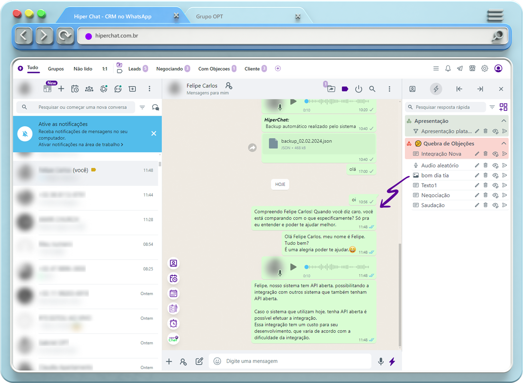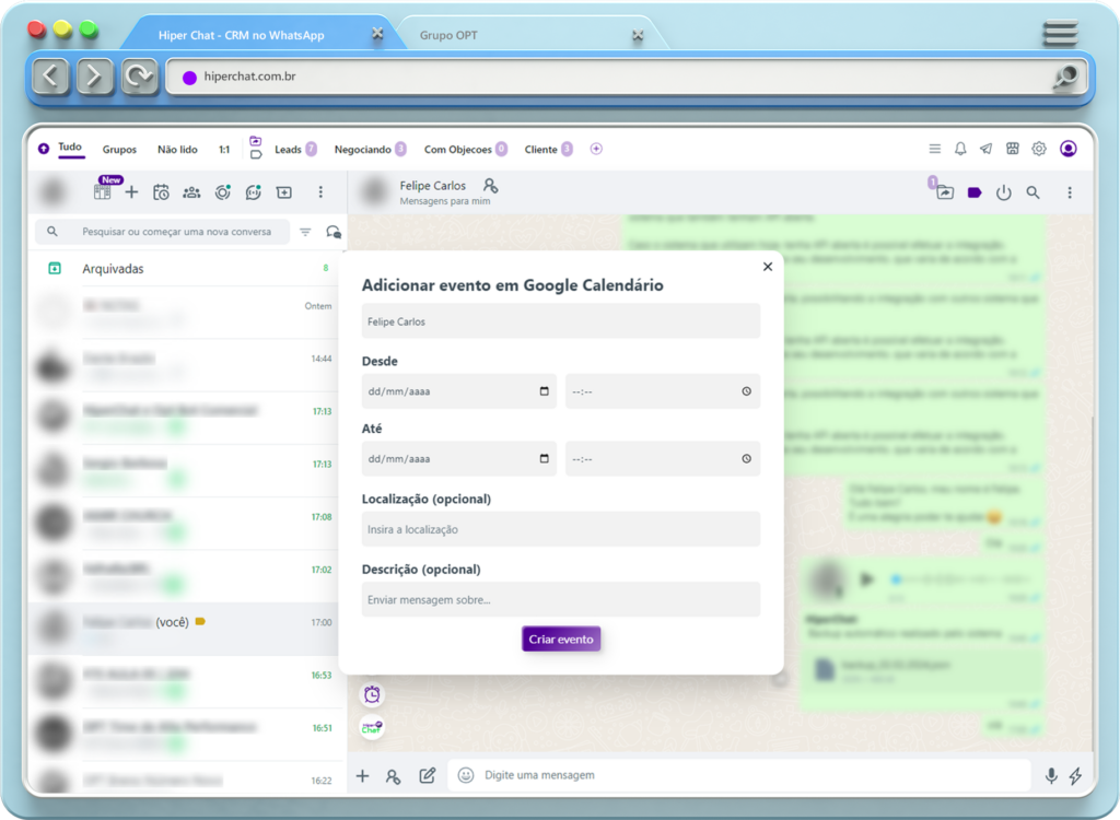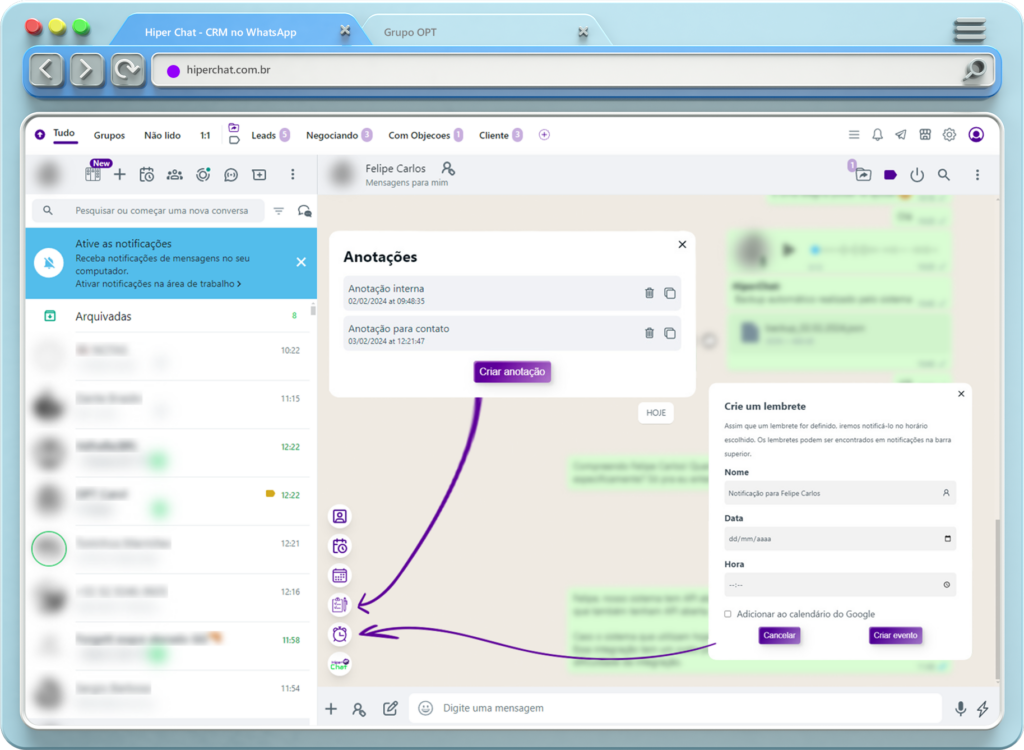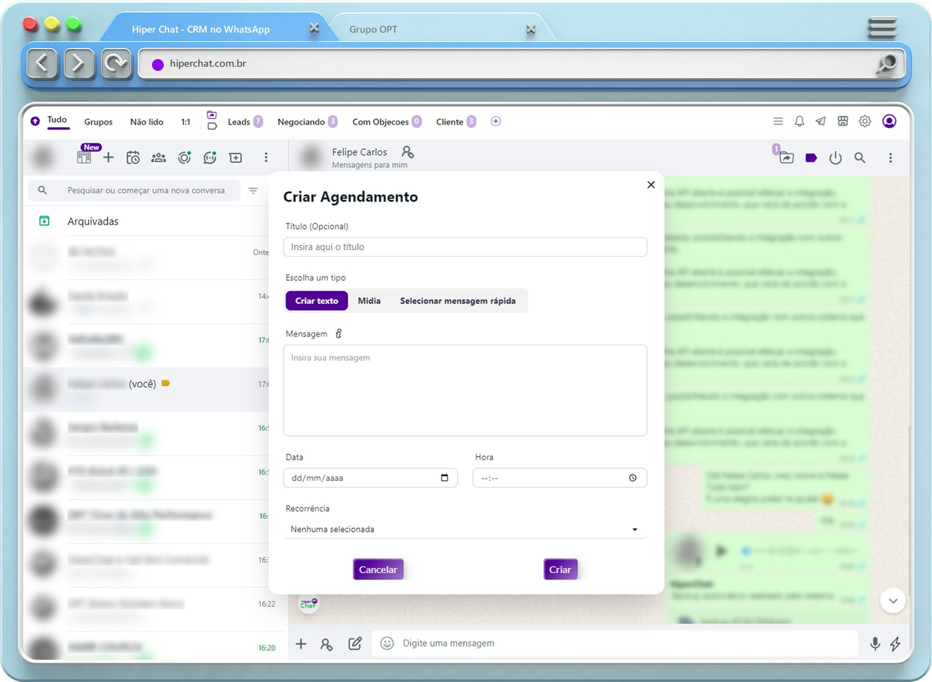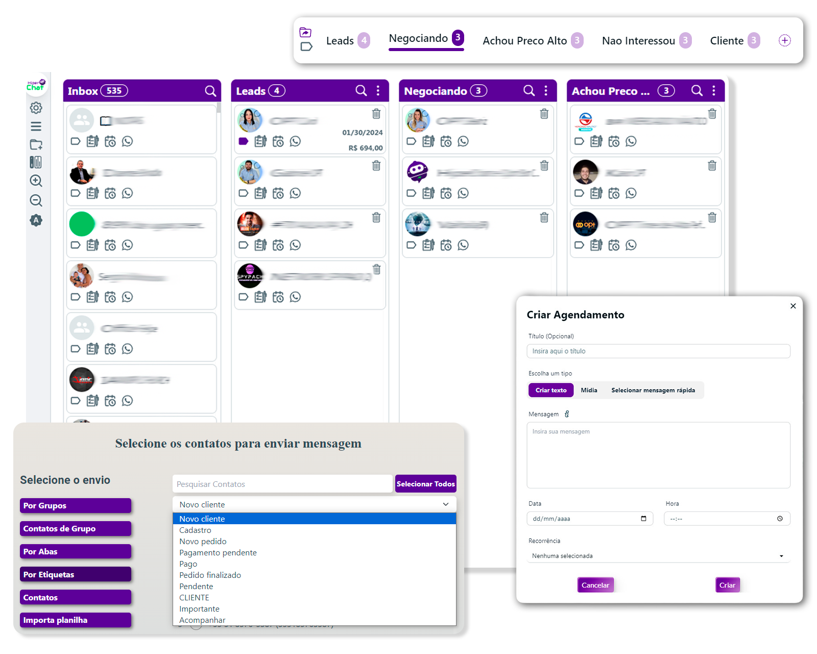 Tenha um CRM de suas conversas, faça envio de mensagens agendadas, envio de mensagens em massa para contatos, para grupos e muito mais.